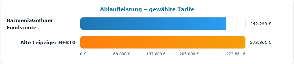 Hier siehst du visulaisiert wie sich die unterschiedlichen Kosten auf die prognostizierte Ablaufleistung auswirken. Bei der Abaufleistung der Alten Leipziger ist unser übliches Vermittlungshonorar von 299€ bereits berücksichtigt.