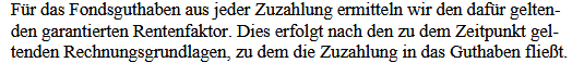 Der garantierte Rentenfaktor legt fest, welche Untergrenze unabhängig von späteren Entwicklungen mindestens gilt. Er gibt also an, mit welchem Mindestwert das angesparte Kapital später in eine lebenslange Rente umgerechnet wird.