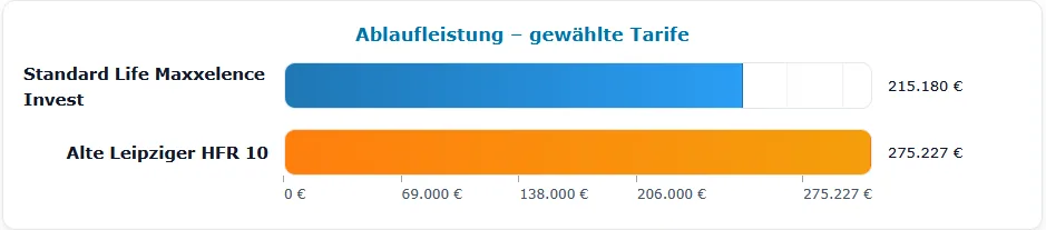 Hier siehst du visulaisiert wie sich die unterschiedlichen Kosten auf die prognostizierte Ablaufleistung auswirken. Bei der Abaufleistung der Alten Leipziger ist unser übliches Vermittlungshonorar von 299€ bereits berücksichtigt.